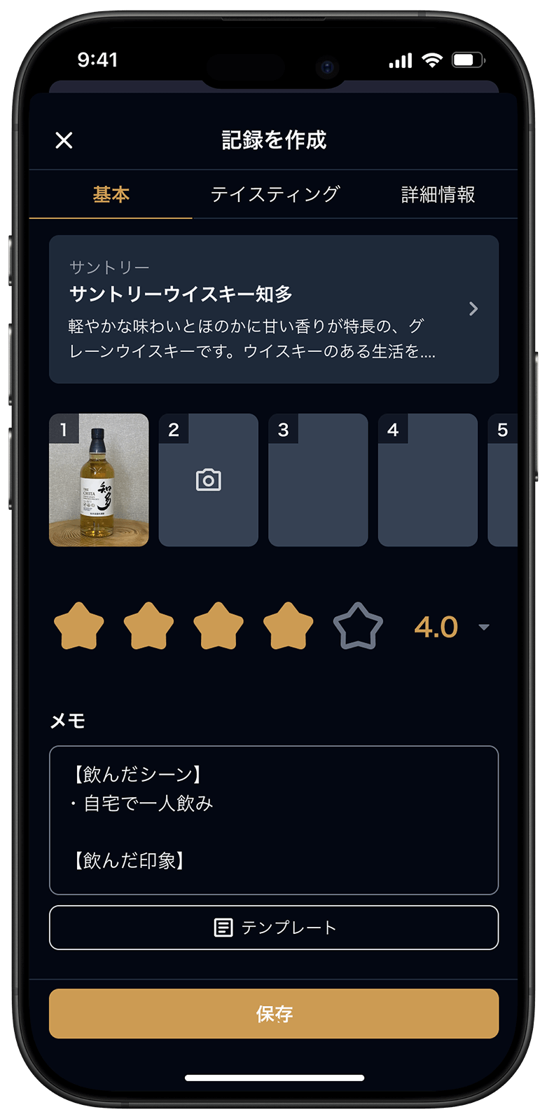 テイスティング機能で 詳細にお酒の味を記録