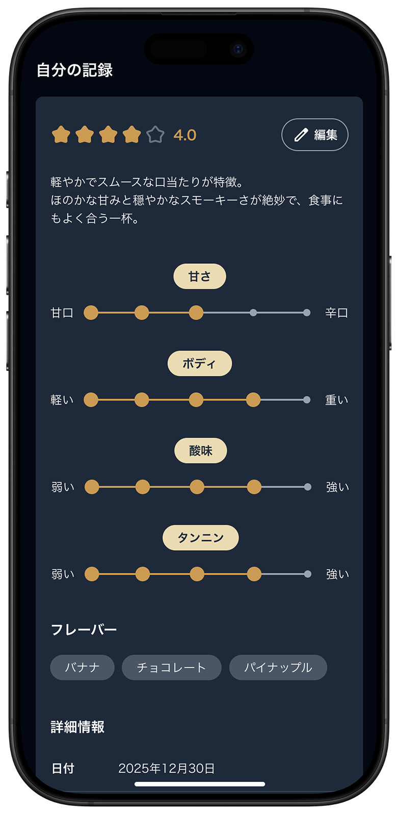 テイスティング項目が用意されており、 あなたの感じた味を詳細に記録できます。
